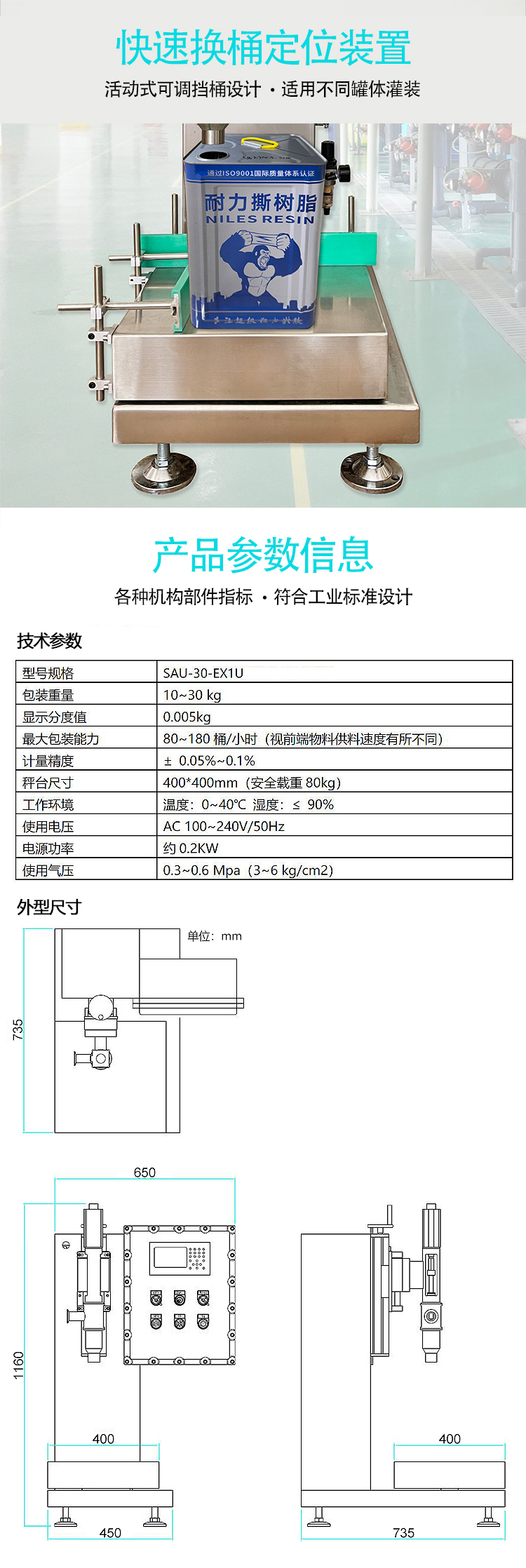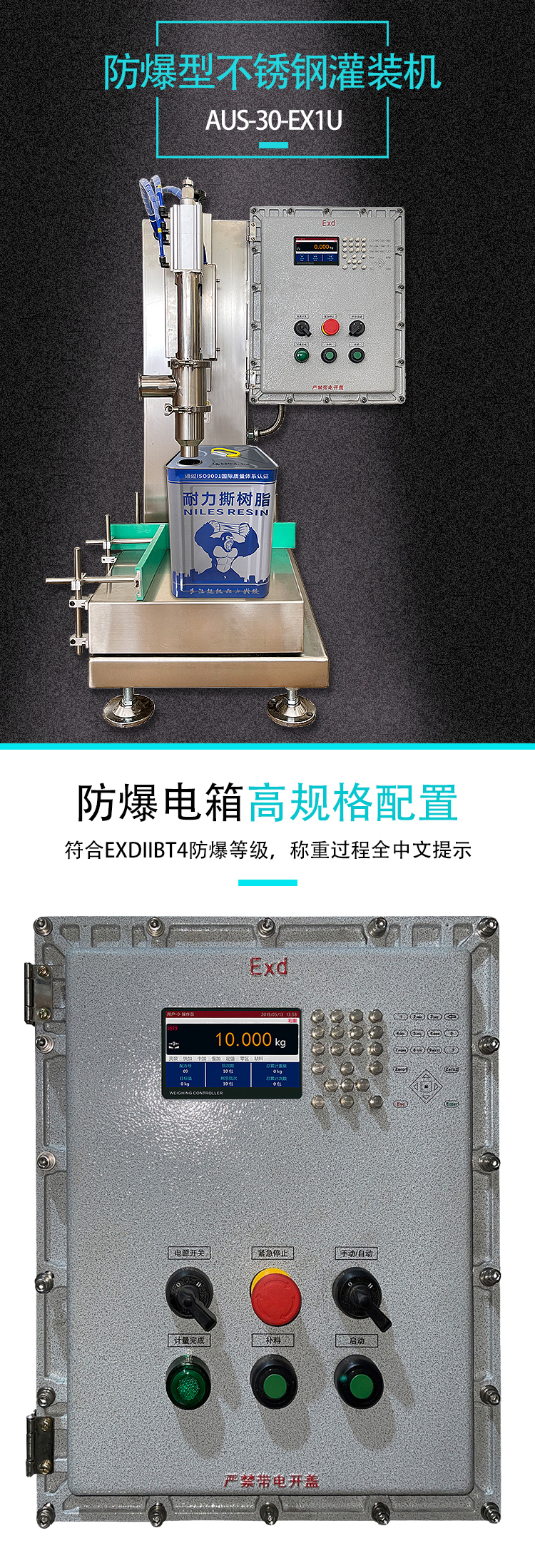 產(chǎn)品描述:SAU-30-EX1U不銹鋼防爆定量灌裝機主要適用于對油類、油墨、樹脂、膠水等流動性好的液態(tài)物料,可適用于10-30Kg范圍的各式金屬桶或塑料桶容器定量灌裝,灌裝過程皆由內(nèi)置系統(tǒng)自動完成...